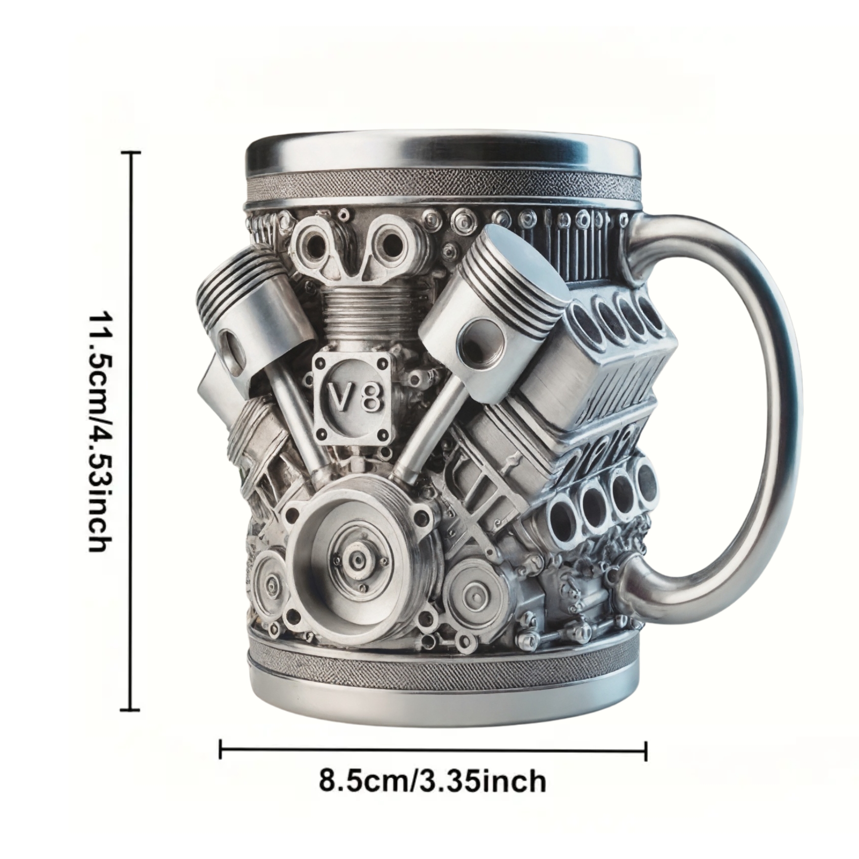 This V8 Engine Stainless Steel Mug is versatile and suited to a wide range of settings. Its distinctive appearance makes it as appropriate for a workbench as it is for a café table.