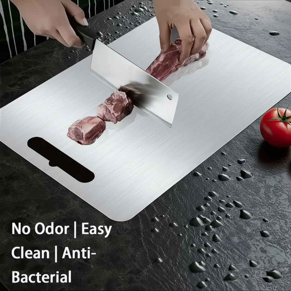 The Stainless Steel Cutting Boards three-piece set provides structure, surface clarity, and sizing flexibility for home cooking routines. Its design is focused on helping users move efficiently through food preparation tasks using non-porous surfaces and easy-clean edges.