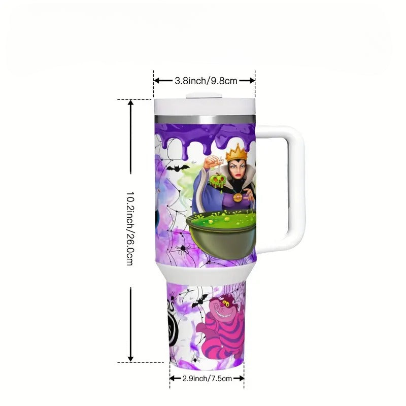 Step into a world of magical mischief with our 40Oz Evil Queen Insulated Tumbler, featuring a vibrant and spellbinding design of iconic characters brewing potions and casting spells. This tumbler is designed for those who revel in the mysteries of fantasy and the fun of animation, making it a perfect companion for any beverage.