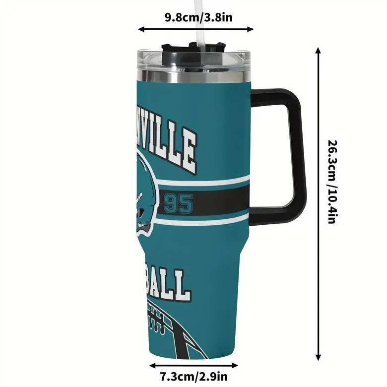 The fitted lid helps reduce spills during movement, while the reusable straw supports controlled sipping. The integrated handle allows easy lifting and carrying between desks, vehicles, and outdoor spaces. The football-inspired graphic design adds visual character without affecting balance or usability.