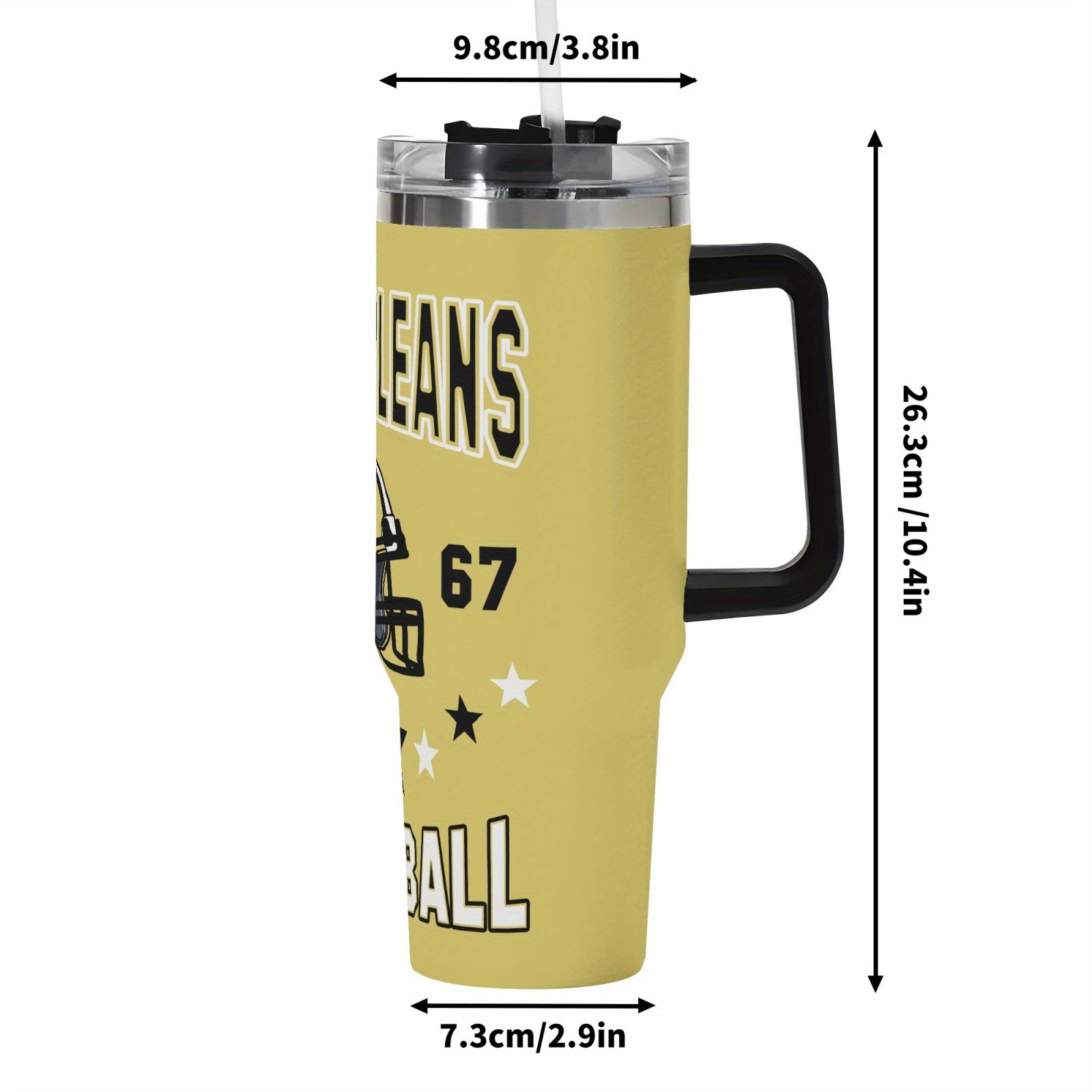 A fitted lid helps reduce spills during movement, while the included straw opening supports convenient sipping. The integrated handle improves portability, allowing comfortable transport between locations. The football-inspired graphic design adds visual character without interfering with balance or usability.