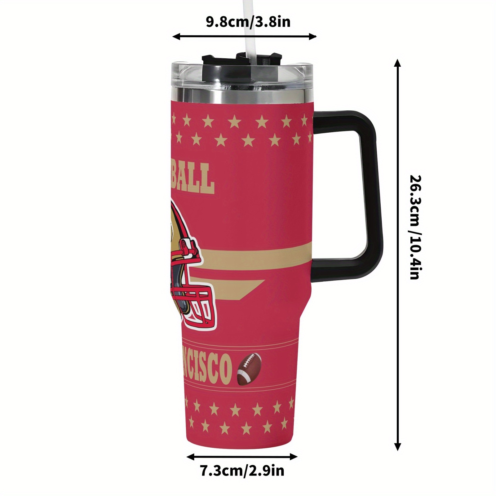 The handle and straw integrate smoothly into the overall design. The travel mug keeps a streamlined profile despite its size. The visual presentation suits sports fans seeking themed drinkware with everyday appeal.