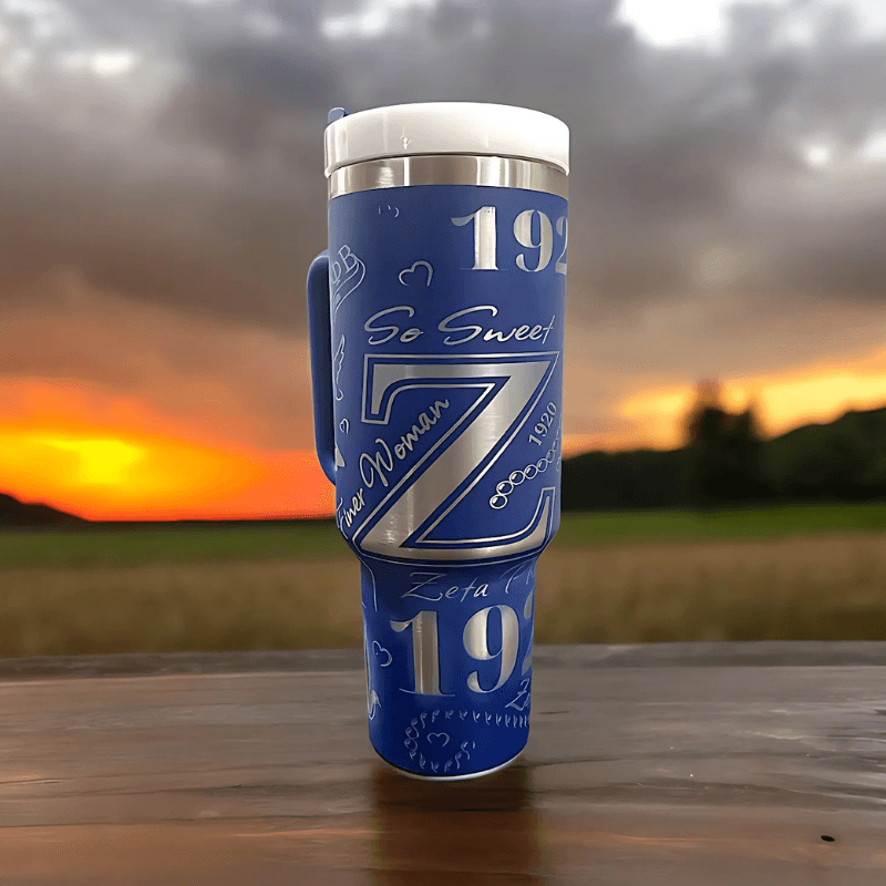 This 40oz stainless steel tumbler features a Zeta Phi Beta-inspired design and a sturdy handle for easy carrying. Designed to maintain beverage temperature for extended periods, it is suitable for both hot and cold drinks. Crafted with sturdy materials, this tumbler is a great choice for everyday use or as a thoughtful gift.