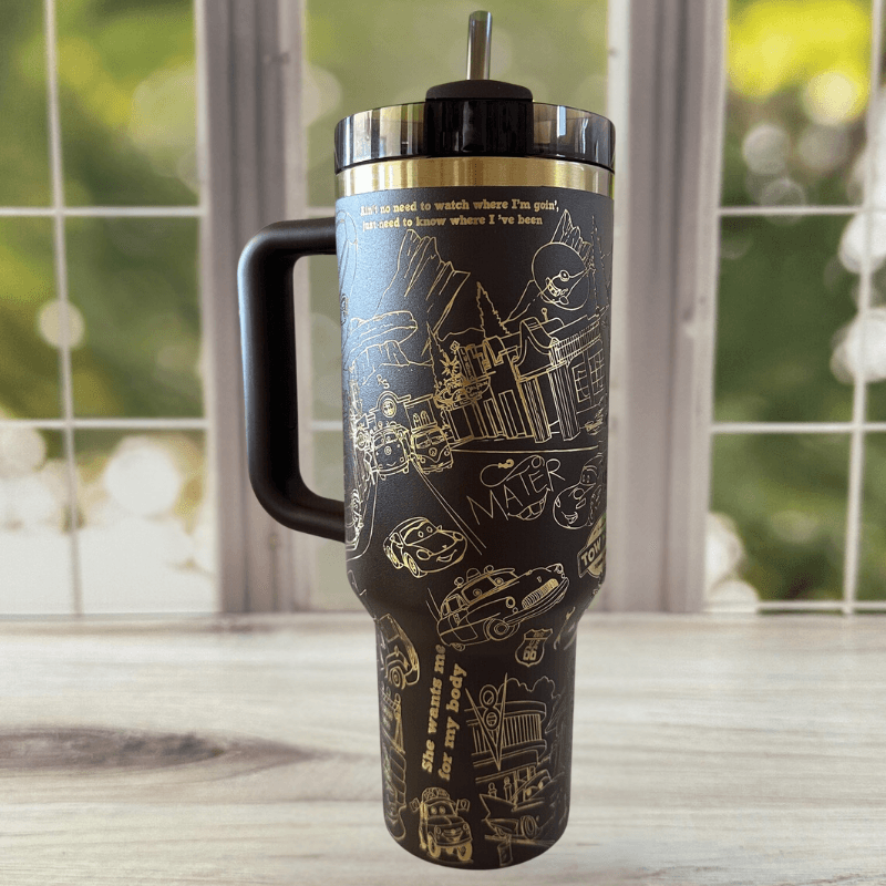 Embrace your passion for the open road with this 40oz Adventure Inspired Tumbler With Laser Engraved Car Graphics, featuring an intricate Cars-themed design. Ideal for long trips, daily use, or any adventure, this tumbler offers ample space to keep you hydrated. The sturdy handle and secure lid help prevent spills, making it a convenient choice for both hot and cold beverages.