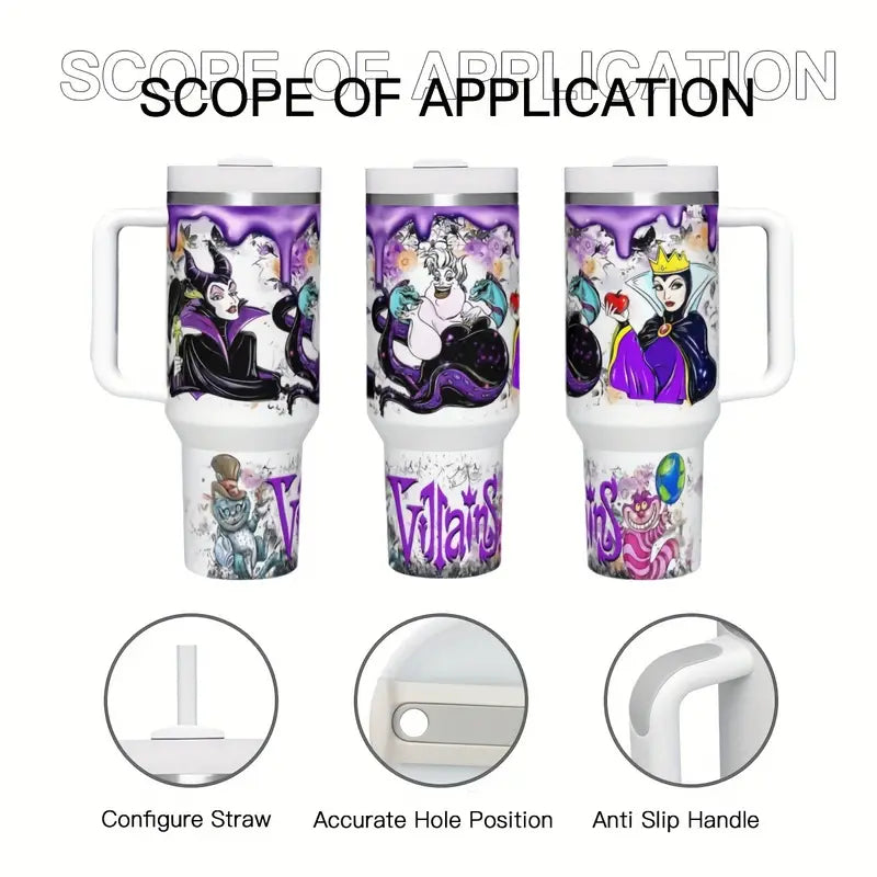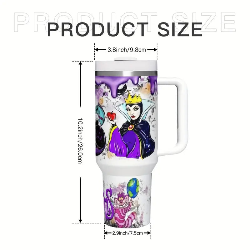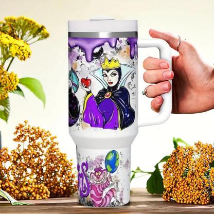 Elevate your drinkware collection with this 40 oz villain and Cheshire Cat Insulated Tumbler with Handle, featuring an intriguing design with iconic characters. Built to maintain your beverage's temperature, this tumbler combines style and functionality.