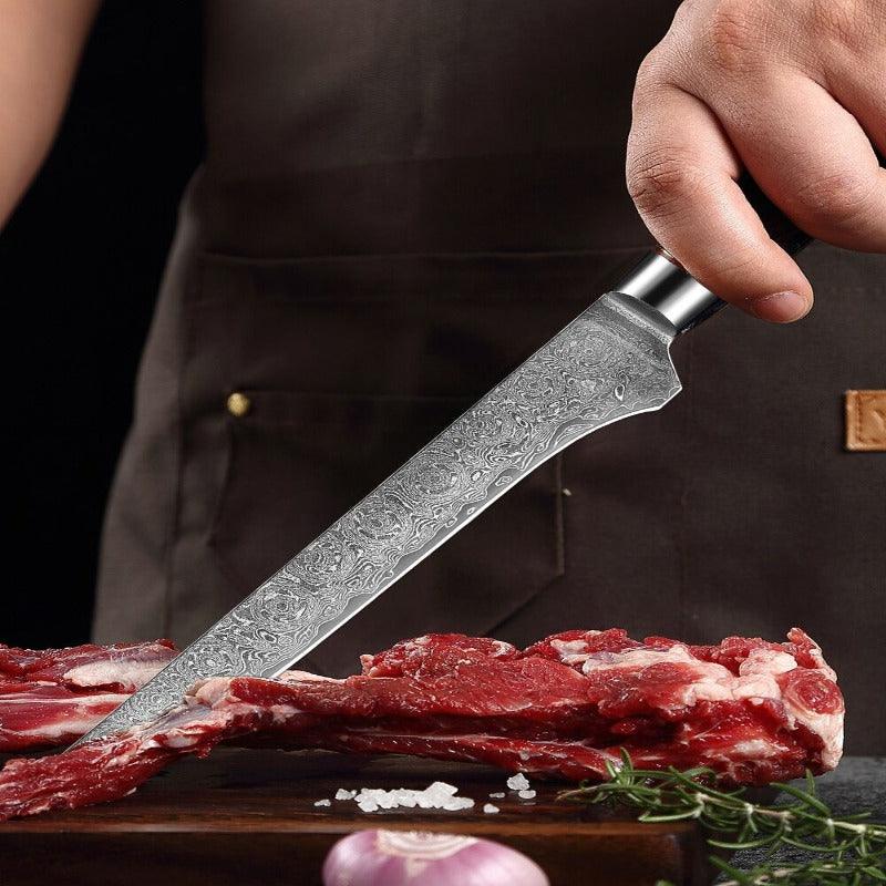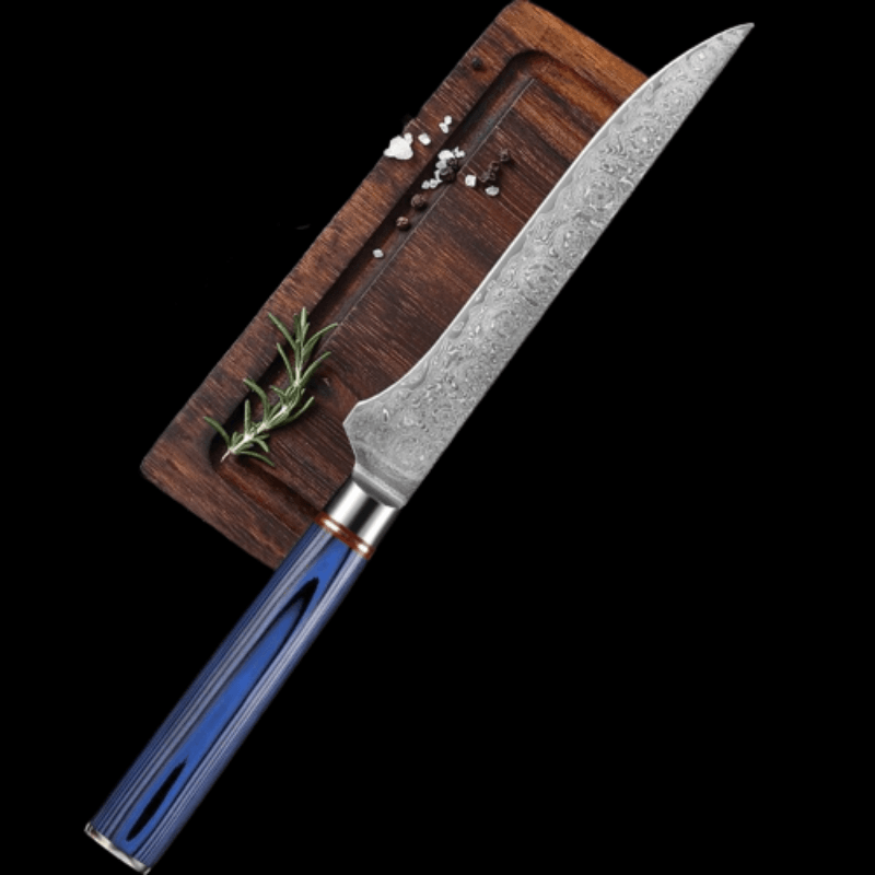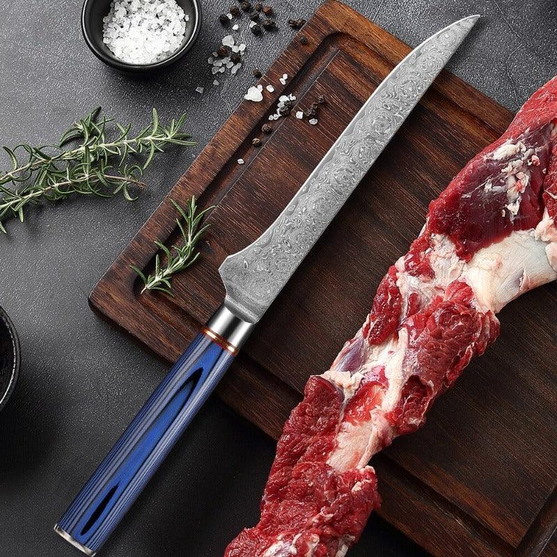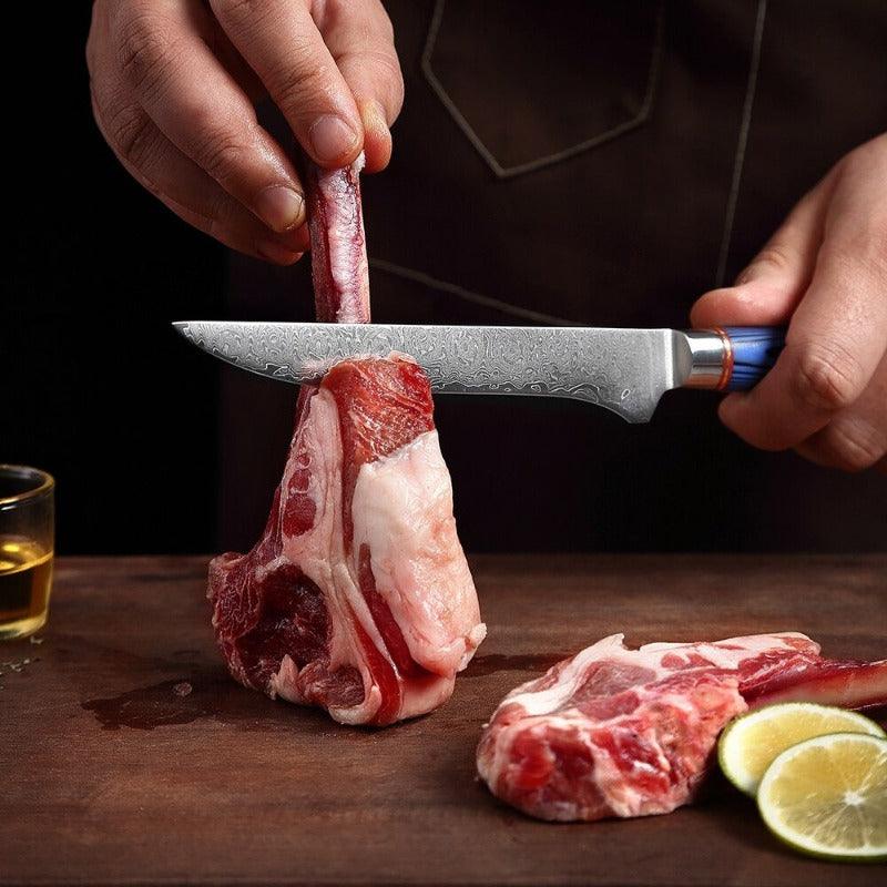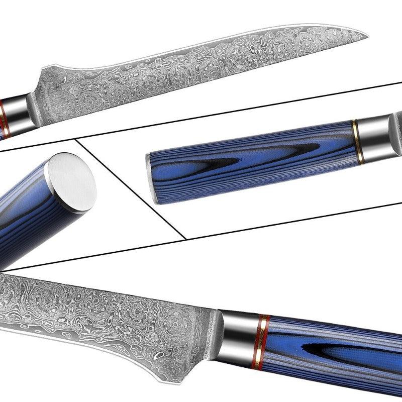 5.5 Inch Versatile Blue Boning Knife has a premium design with a sleek blue color handle which makes it look classy. It has a handle of 11 cm along with a edge made from carbon steel which is 14.5 cm in length. It has razor-sharp edges making it perfect for kitchen use in slicing and chopping and its round handle makes the hold easy.