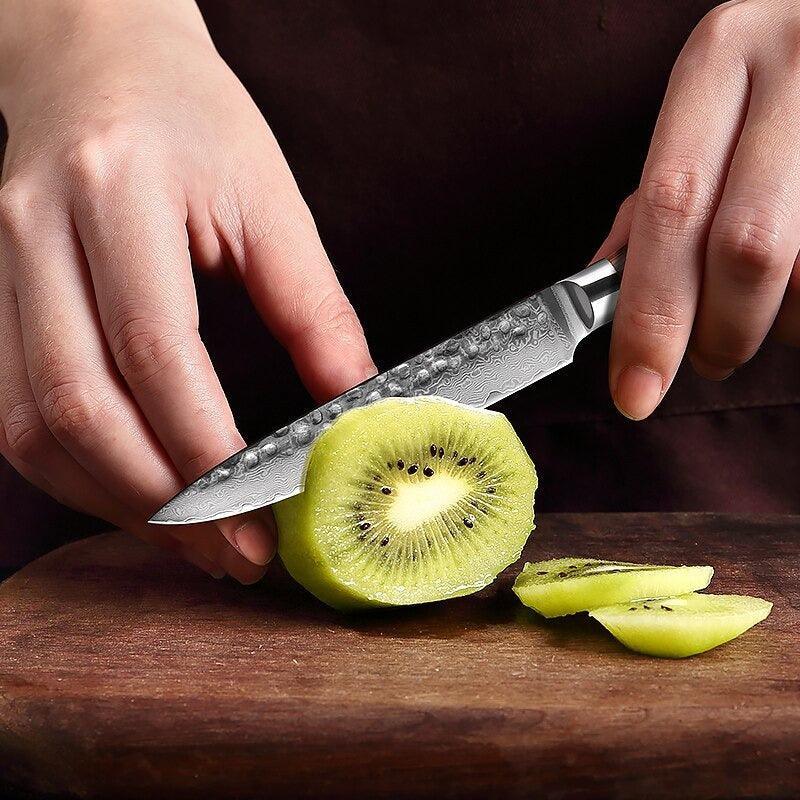 5.5" Utility Knife High-Quality Damascus Steel has been designed to slice through delicate vegetables perfectly. The angle of the edge and handle allows the vegetables to be cut from top to tip in one drawing motion.  An ergonomically designed non-slip handle provides comfort while doing cutting tasks.