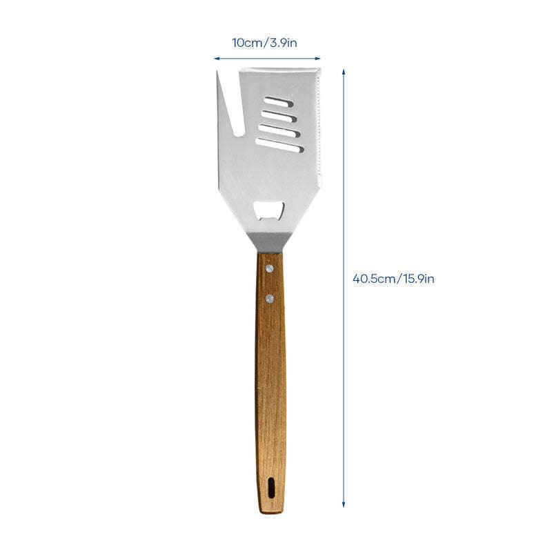 Multi-Function Tool: This grilling utensil combines a spatula, fork, knife, bottle opener, and scraper, providing all the essential tools in one convenient design.