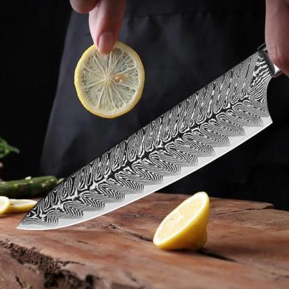 6 Inch Boning Knife With 67 Layers of Damascus Steel is a uniquely designed knife with a black ebony handle to give a perfect hold of it for the users. It has 67 layers of Damascus steel design on it with a sharp edge, making it perfect for slicing and cutting meat, fruits, and vegetables. It has a length of 27.8 cm, making it an ideal knife for kitchen use.