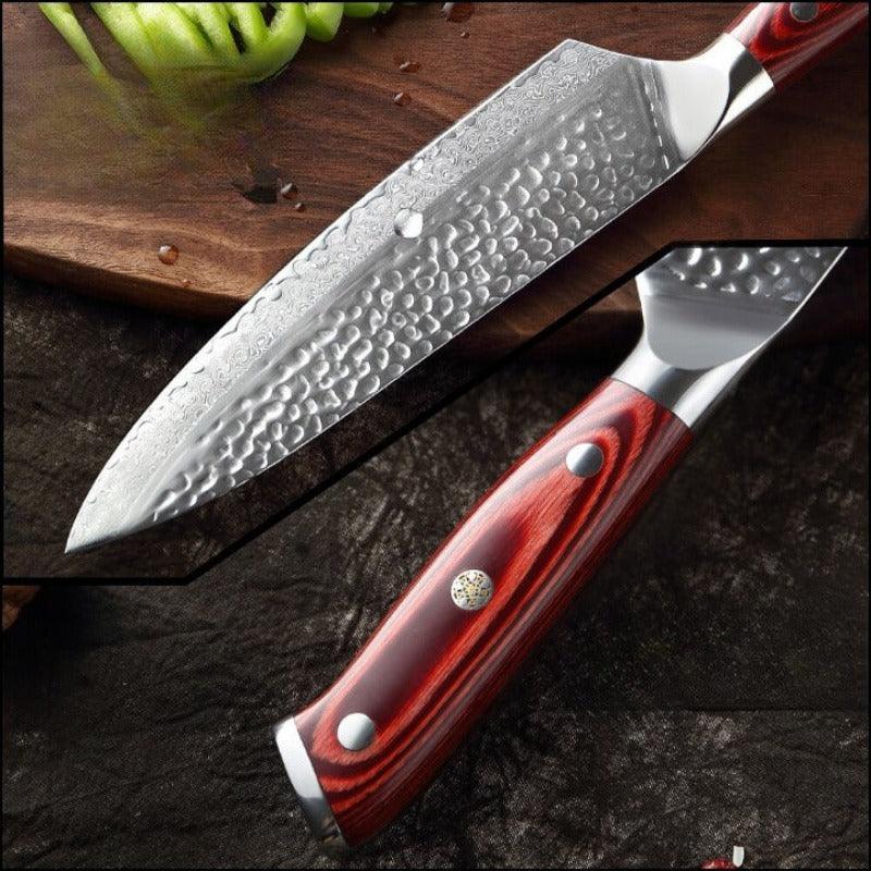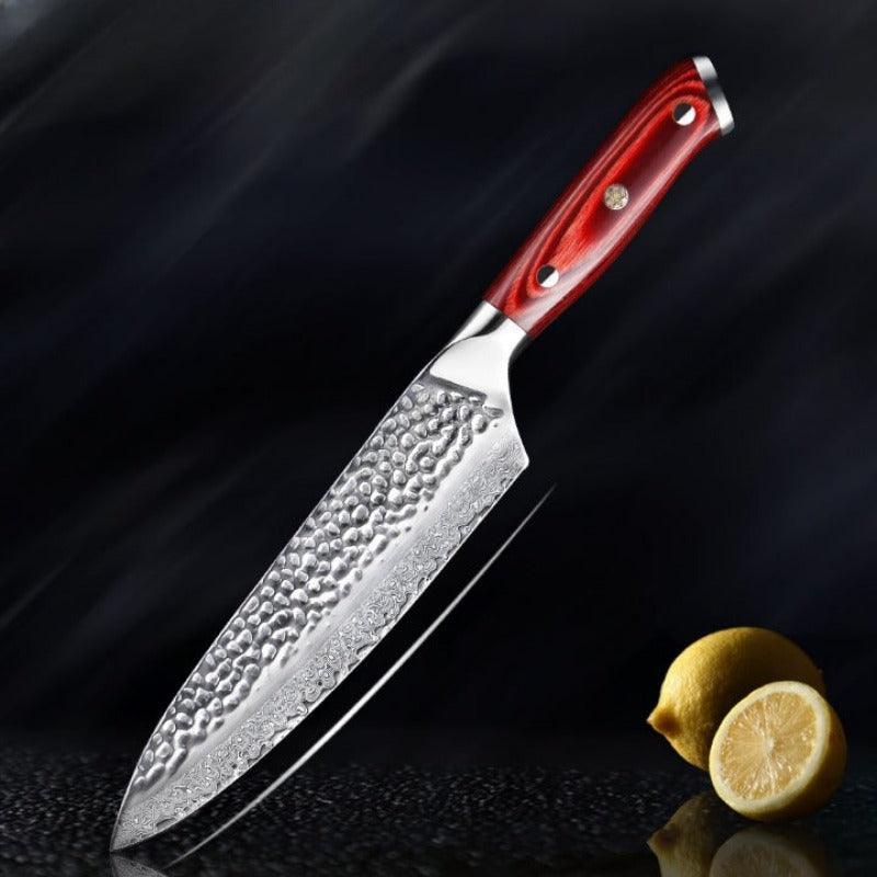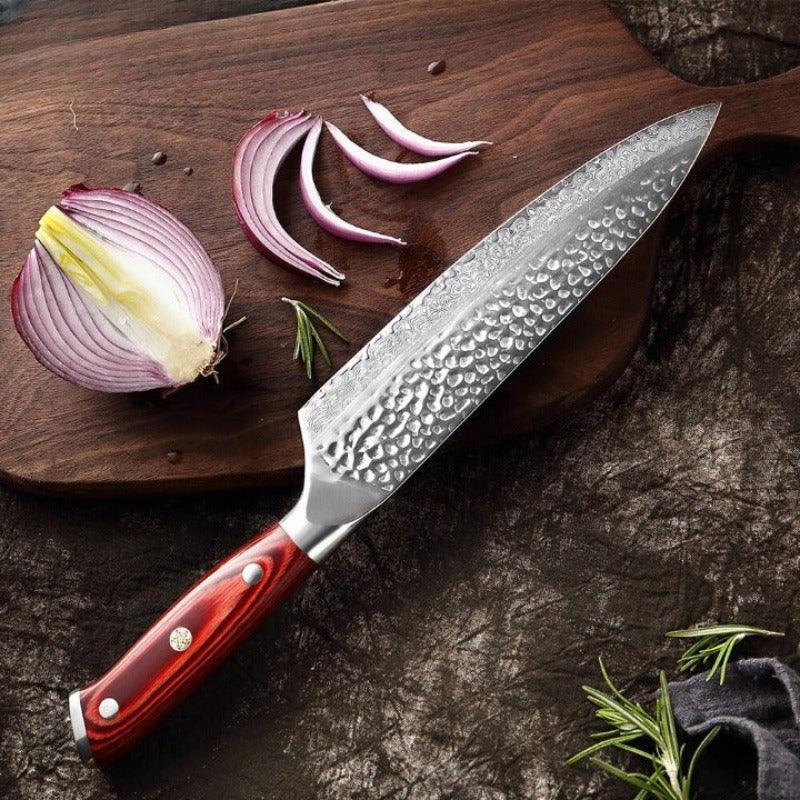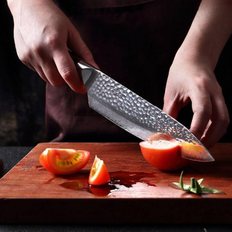7.5 Inch Damascus Steel Forged Chef Knife is not only sharp, but the design is also world-class. The ultra-premium handle of our Damascus Chef Knife, which is designed for superior control, agility, and comfort, has gone through special treatment, making it extremely impervious to heat, moisture, and cold with military-grade strength and life-long sturdiness. Even if you use it for a long time, you won't feel tired and uncomfortable no matter your hand size or where you grip.