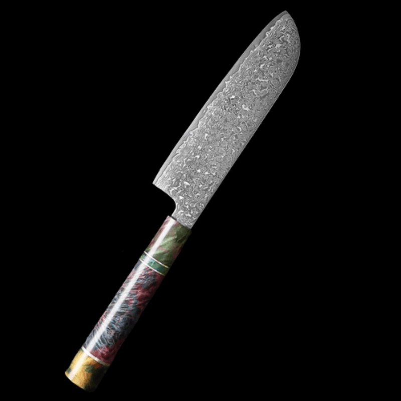 Material: Damascus Steel Feature: Eco-Friendly Knife Type: Santoku Knives Blade: 67 layers of high carbon Damascus steel Handle: Colorful stable wood round handle Sharpness: Razor Sharp Good for: Professional Kitchen BBQ Cook Hotel Home Garden Gifts Dining Bar Knife Uses: Frozen Santoku knife serrated Cutter Slicing Filleting Steak Utility