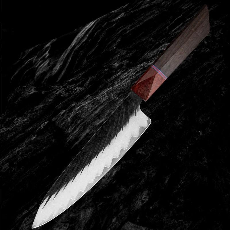8 Inch Japanese Santoku Knife has flat razor-sharp edges made from stainless steel, which is 8 Inches long. It has a wooden handle which is sleek and makes it easy to hold. It is best used for chopping meat, fish, and vegetables and it is lightweight and durable as well.