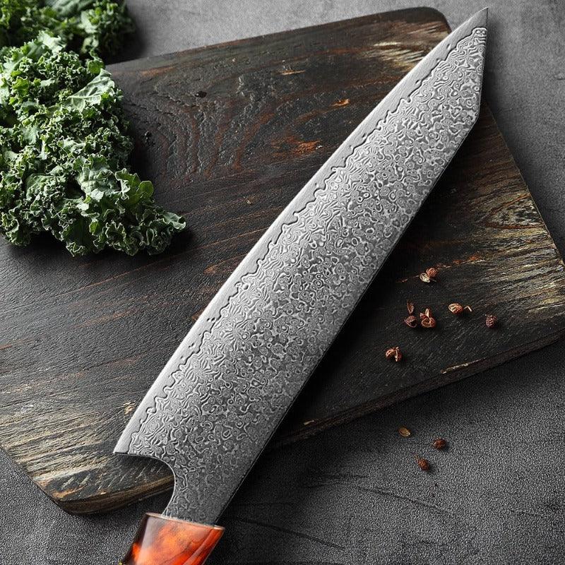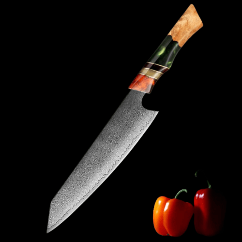 8 Inch Multifunction Sharp Chef Knife is an anti-rust, durable, and lightweight knife, which makes sit the ideal knife for the kitchen for everyday use. It has sharp edges edge made from Damascus steel with a pattern on it, to make it look unique along with its resin wood multi-color handle with a perfect shape to fit your hand and hold it.
