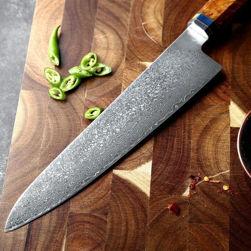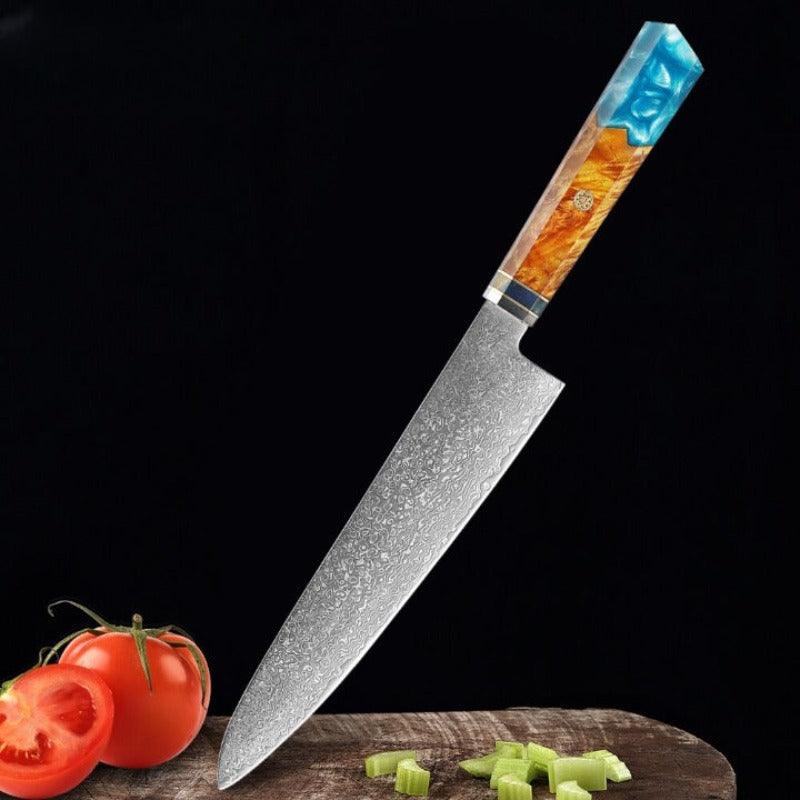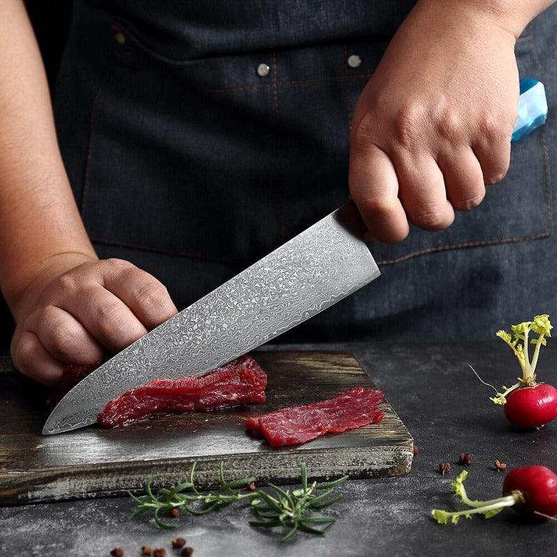 This 8 Inch Professional Chef Knife With Blue Resin Handle has aserrated edge that allows you to cut cleanly through steak that has a thick or tough exterior and a softer or juicier interior. Built with Damascus steel to ensure excellent strength, durability, and rust resistance.