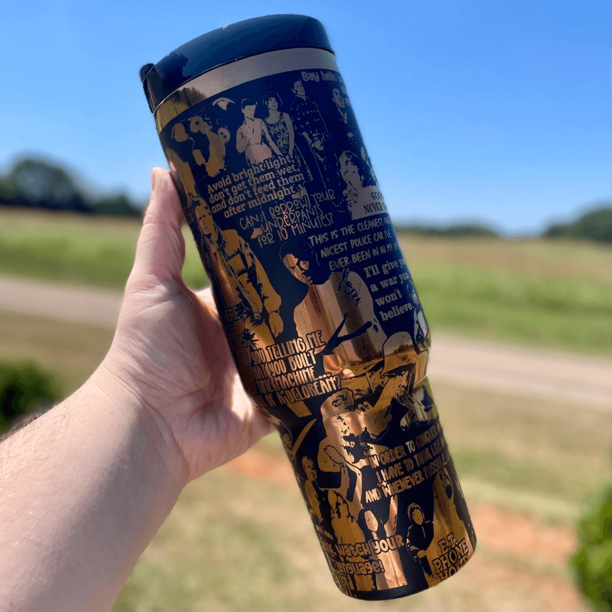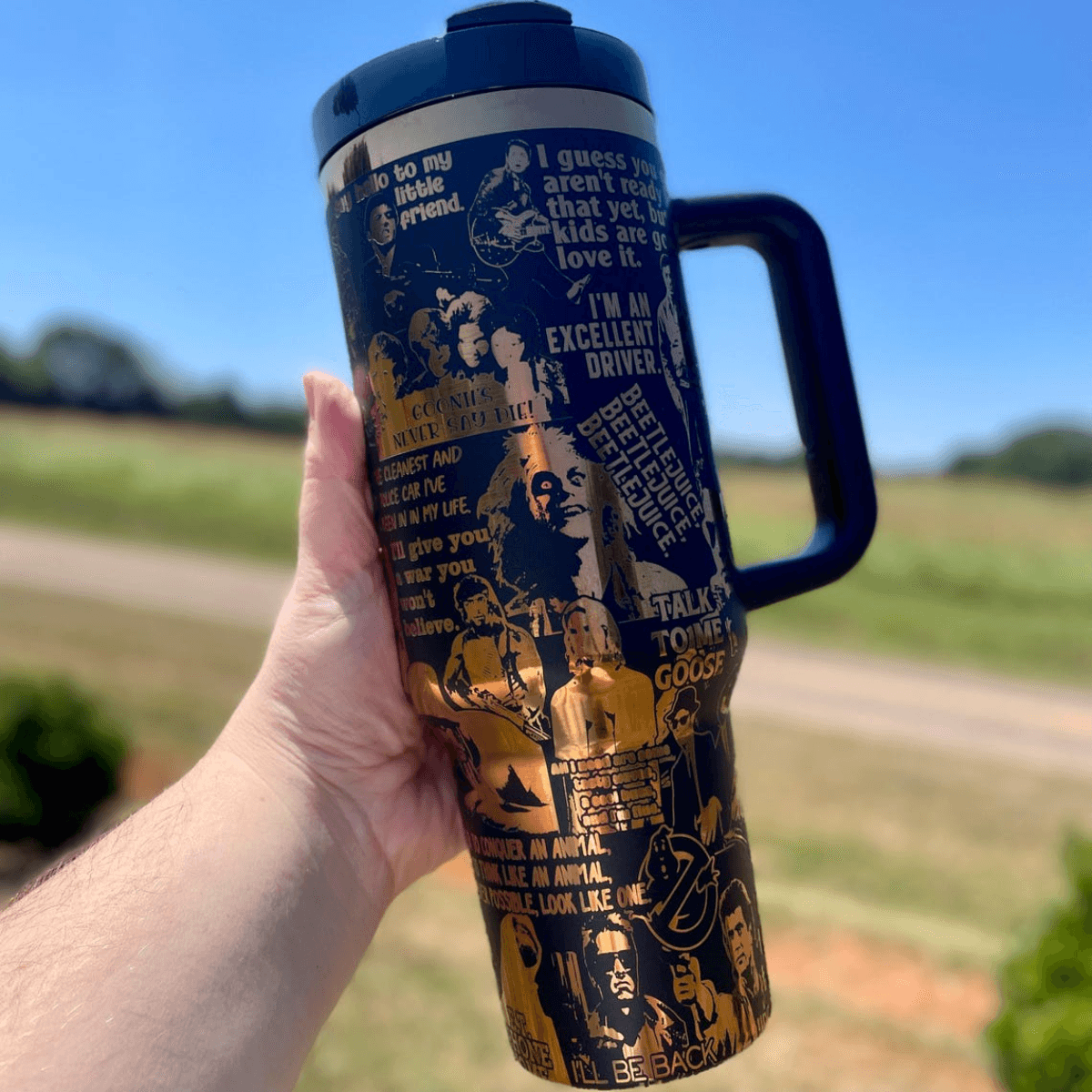 Relive the magic of classic 80s films with this 40oz engraved stainless steel tumbler. Featuring double-wall insulation, it keeps drinks at the same temperature for hours. A must-have for movie enthusiasts and retro fans.