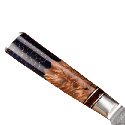 9.5 Inch Blue Honeycomb Resin Chef Knife is made out of 67 layers of Damascus Steel accompanied by a glossy blue honeycomb resin handle to ensure sturdy grip and comfort while you work with it. It will ensure excellent strength, durability, and rust resistance and also comes with a free sheath.