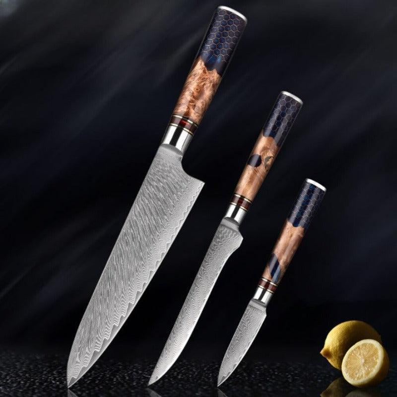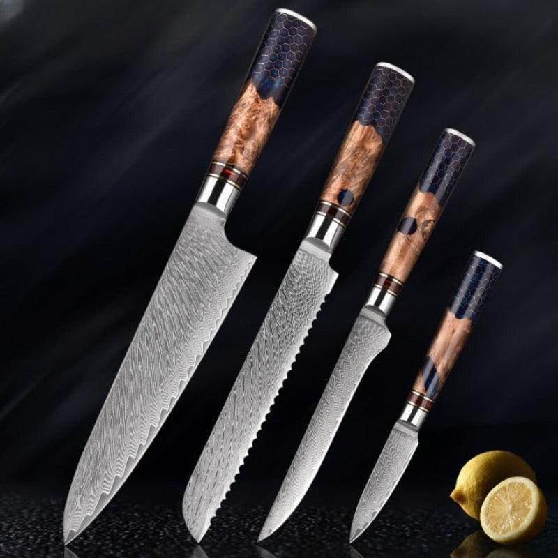 Blue Resin Honeycomb Handle Kitchen Knife Set has 9 different types of knives and it comes in different set styles starting from a set of 2. You can select as per your requirement the types of knives you need, as every piece has a different shape, edge length, and design with a blue resin wood handle.