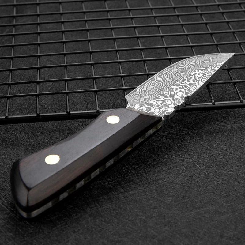 Damascus Full Tang Utility Knife With Sheath has a mini blade which makes it compact in size. It has a blade made from Damascus steel, making it suitable and anti-rust. It has a unique pattern on the blade which adds to its look, along with an ebony handle to give perfect hold. It comes with a brown color leather sheath to keep it safe and its edges sharp.