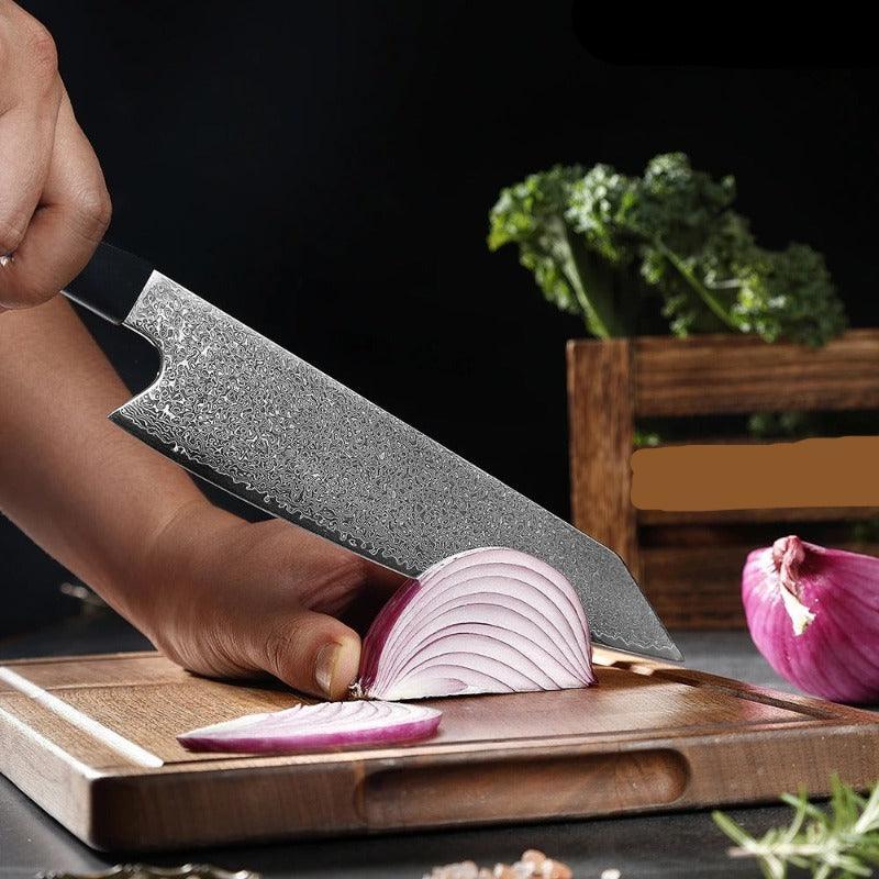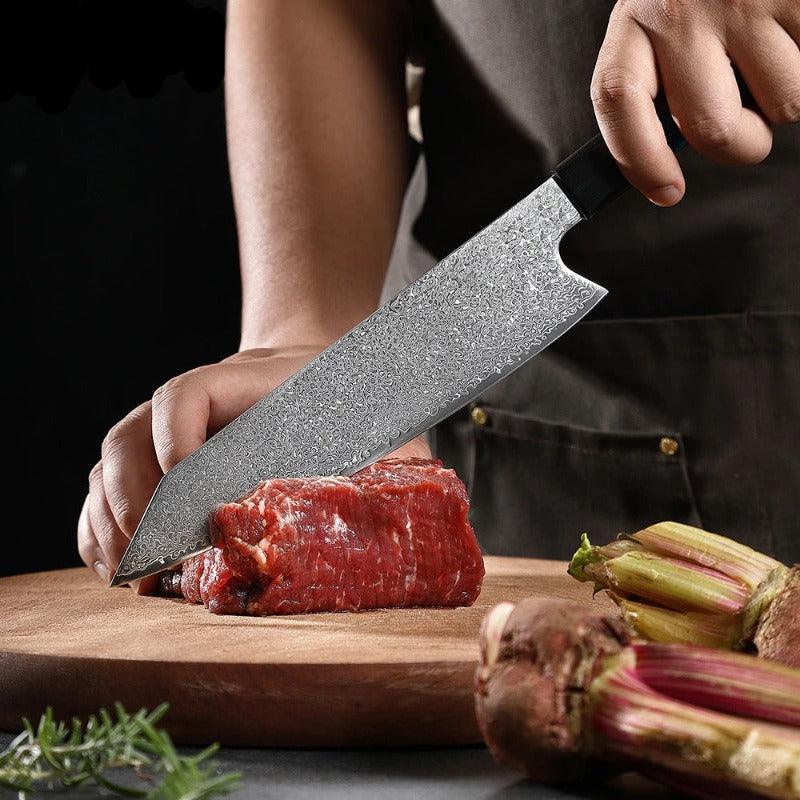 Damascus Steel Chef Knife With Blue Resin Handle is the ideal knife for slicing fruits or vegetables. It has a 21 cm long blade made from carbon steel along with a big brown and blue color round wooden handle which makes it elegant and with a great grip to make it easy to use.