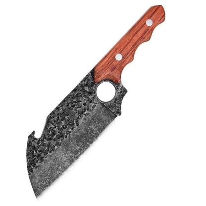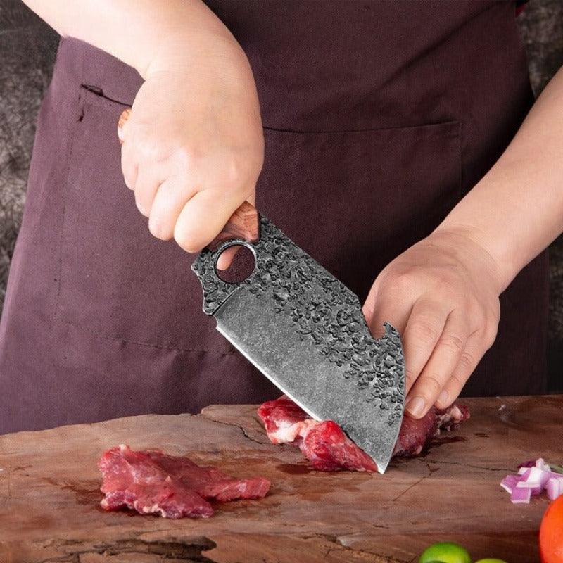 Forging Handmade High-Carbon Steel Chef Knife It's made of high-carbon steel with hammer trace hardness and anti-corrosion, anti-rust, and toughness. Beautiful and healthy at the same time. It has a tough rosewood handle with two nail fixations to make it stable. It is suitable for mincing and dicing fruits, cakes, and vegetables.
