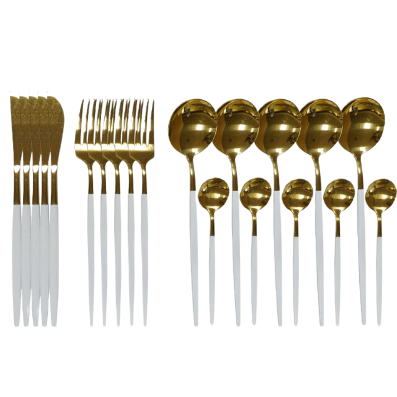 Gold Color Stainless Steel Cutlery Set is the ultimate destination for premium dinnerware. This set is meticulously crafted with high-quality stainless steel, ensuring durability and long-lasting beauty. The stunning gold color, achieved through pigmented technics, adds a touch of luxury to your dining table. With spoons, forks, and knives neatly arranged in a complete kit, this set caters to all your dining needs. The solid pattern and Western styling exude timeless charm and complement any table setting.