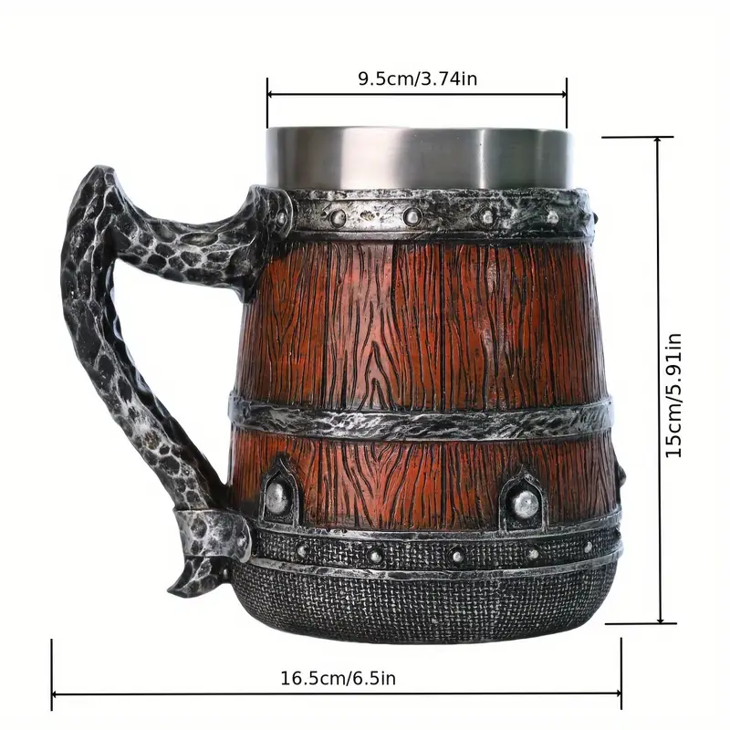The mug’s body features a detailed wood-style finish, giving the appearance of a traditional cask.