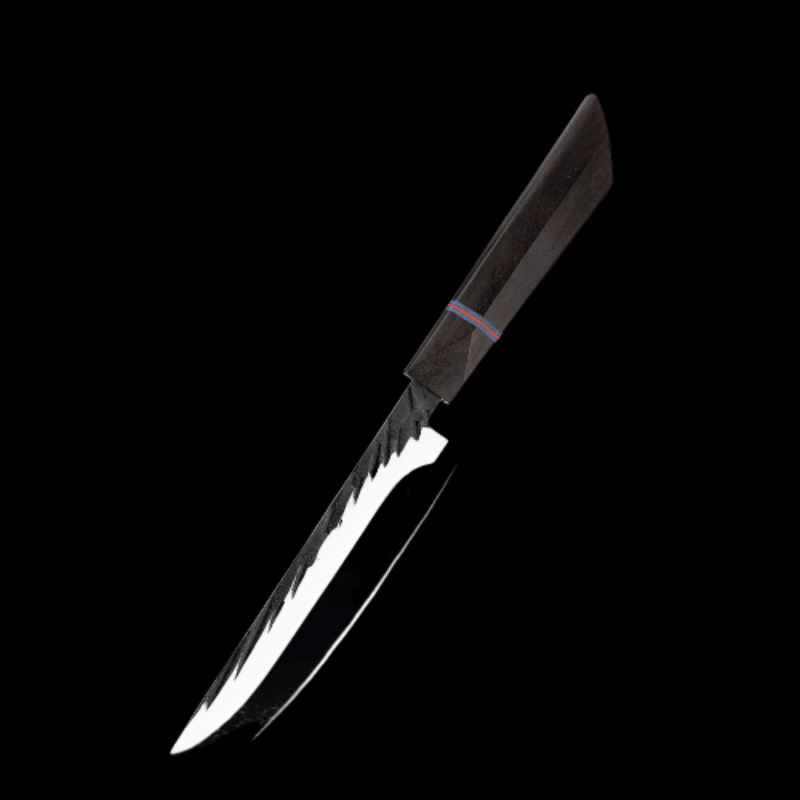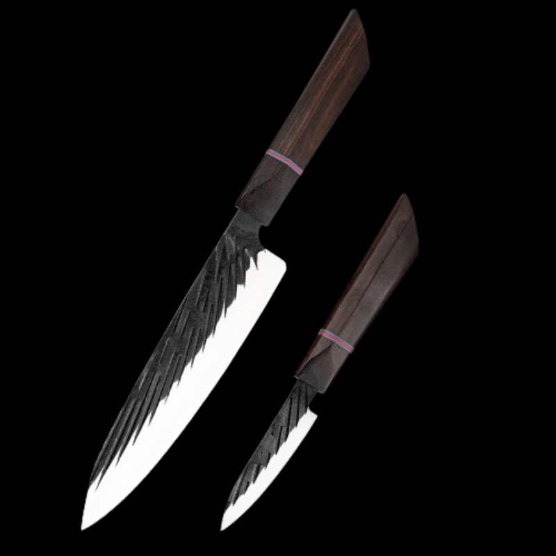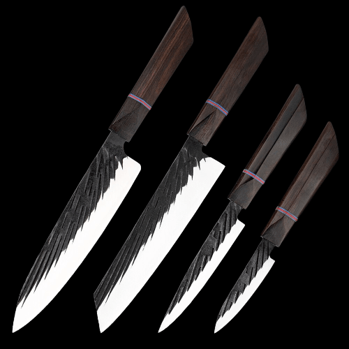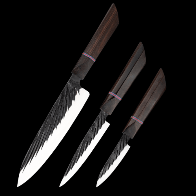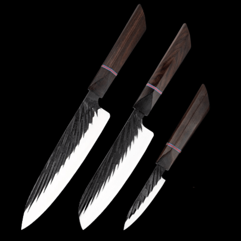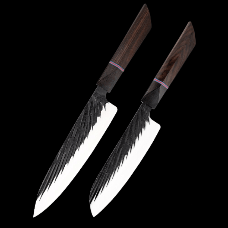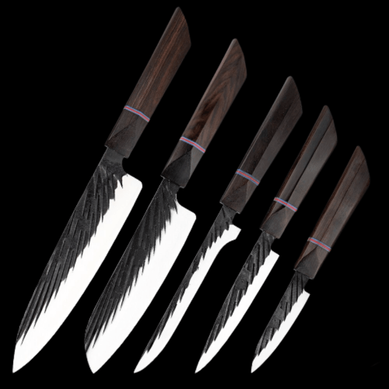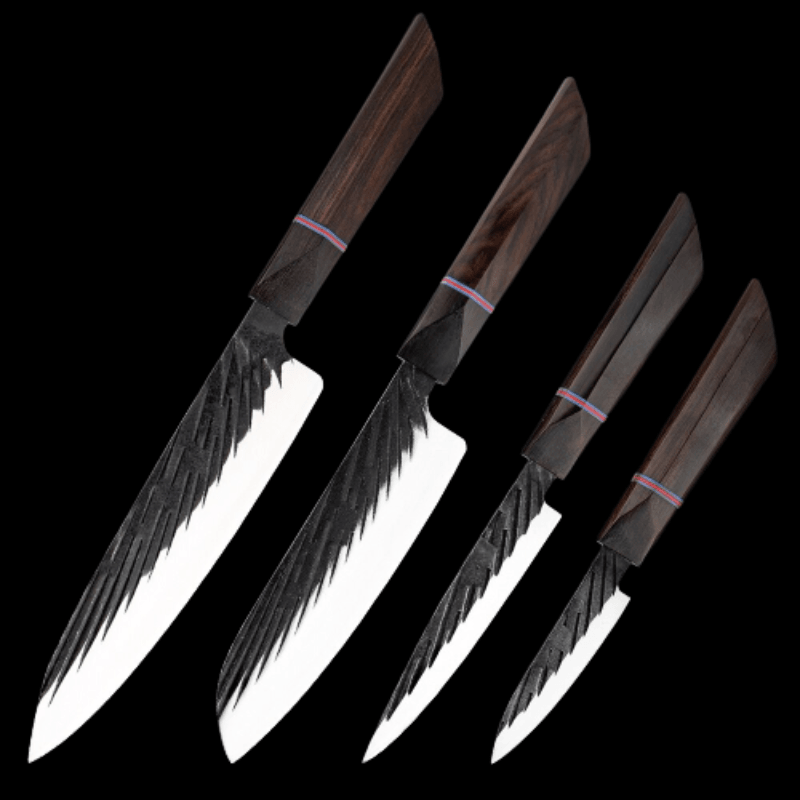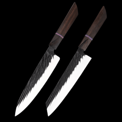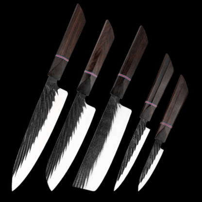 Handmade Forged Japanese Kitchen Knife Sets have different types of knives with different blade lengths, making them suitable for cutting, chopping, slicing, etc for any food item like fruits, vegetables, and other food items. It is a perfect set of knives for the kitchen as it has a high-quality wooden handle too which makes it durable.