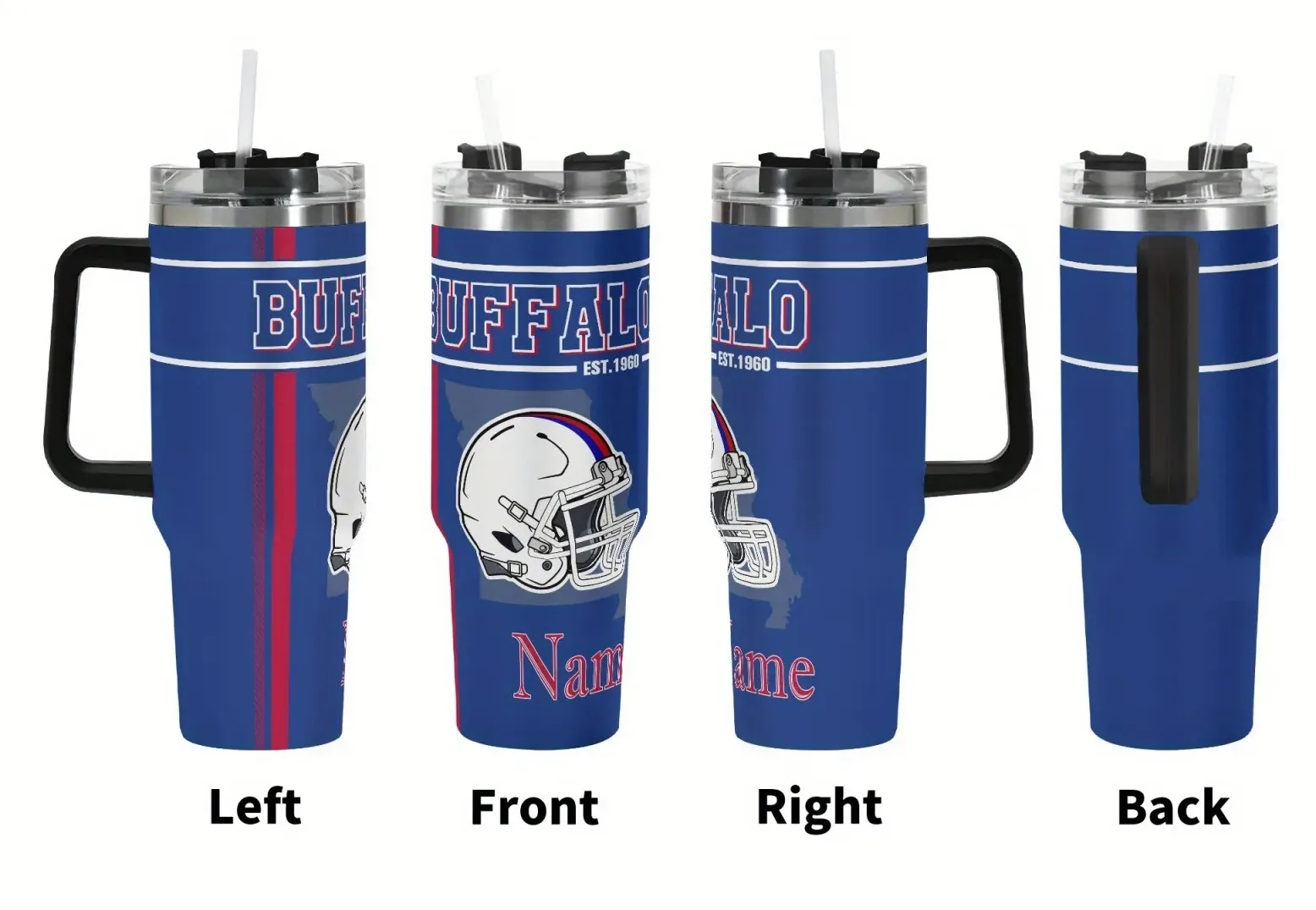 Personalized Buffalo Bills Themed Travel Mug is a 40oz travel mug designed for daily drink routines with a football-themed wrap layout similar to the image shown. The design includes bold “Buffalo” text placement, a helmet graphic, and a name customization area, creating a team-inspired look that stays visible from multiple angles, including the left, front, right, and back views. This mug includes a handle, a fitted lid, and a straw, making it suitable for commuting, desk use, school schedules, outdoor outings, and travel plans.