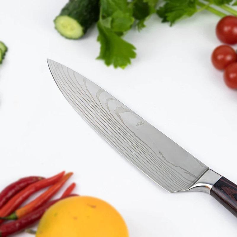 Pattern: The Damascus steel blade features a distinctive, wavy pattern that's both aesthetically pleasing and functional, reducing drag and sticking of food.