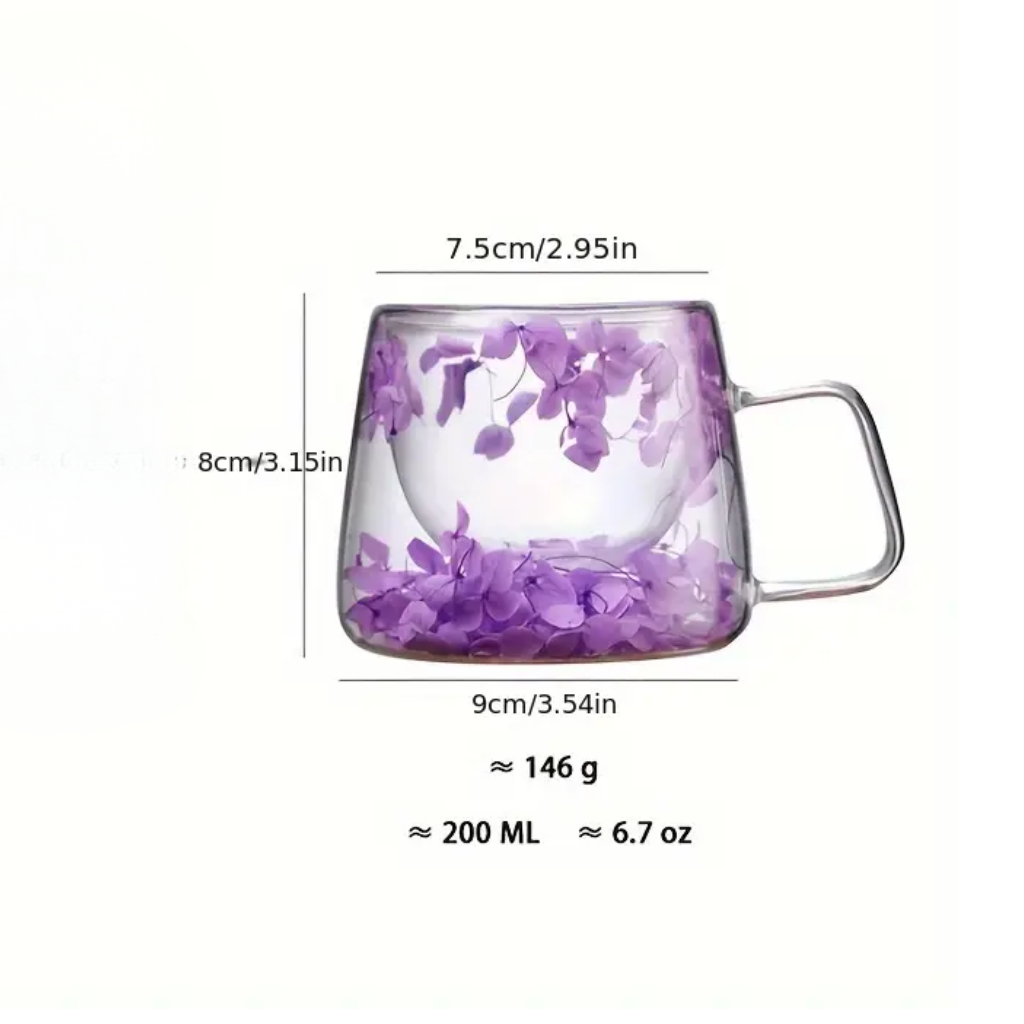 The internal wall holds your beverage, while the outer transparent layer displays preserved blooms that appear to float gracefully within the glass. Whether you’re enjoying morning coffee, herbal tea, or an evening dessert drink, the Blooming Floral Glass Mug adds charm and personality to every sip. This mug is not only functional but also serves as a decorative addition to any home, café, or office setting.